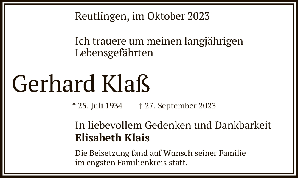 Hier finden Sie alle Traueranzeigen aus der Zeitung, die bisher für Gerhard Klaß erschienen sind. Weitere Traueranzeigen, die in der Zeitung erscheinen, werden hier ebenfalls aufgelistet