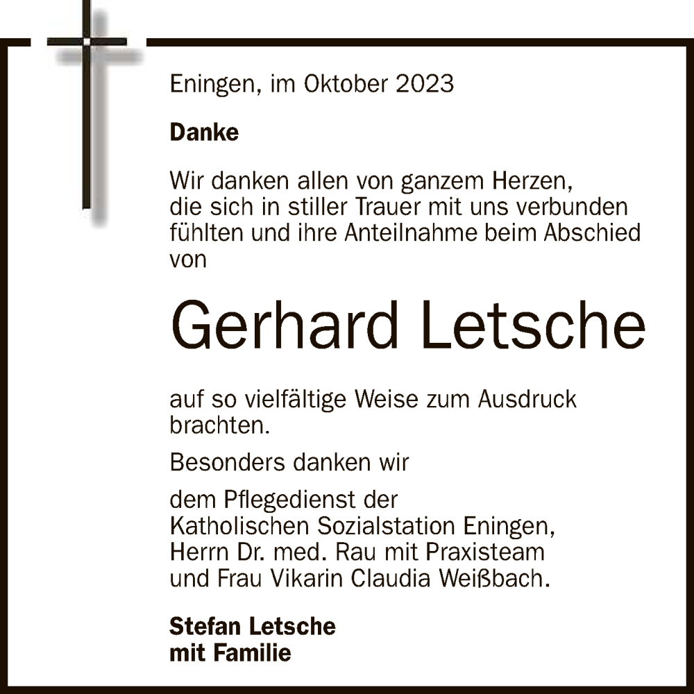 Hier finden Sie alle Traueranzeigen aus der Zeitung, die bisher für Gerhard Letsche erschienen sind. Weitere Traueranzeigen, die in der Zeitung erscheinen, werden hier ebenfalls aufgelistet