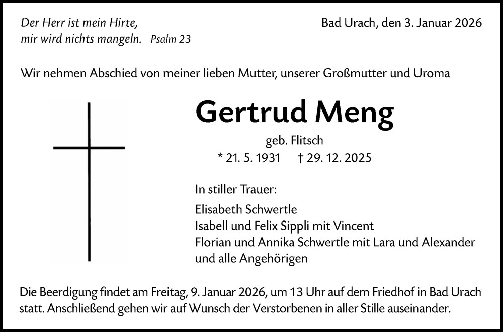 Hier finden Sie alle Traueranzeigen aus der Zeitung, die bisher für Gertrud Meng erschienen sind. Weitere Traueranzeigen, die in der Zeitung erscheinen, werden hier ebenfalls aufgelistet