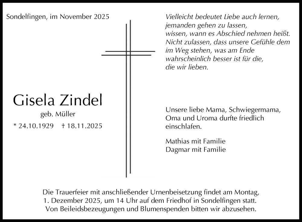 Hier finden Sie alle Traueranzeigen aus der Zeitung, die bisher für Gisela Zindel erschienen sind. Weitere Traueranzeigen, die in der Zeitung erscheinen, werden hier ebenfalls aufgelistet