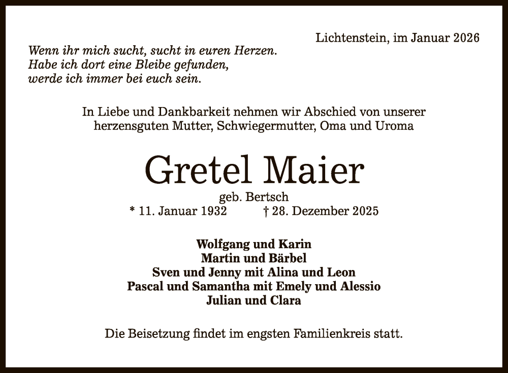Hier finden Sie alle Traueranzeigen aus der Zeitung, die bisher für Gretel Maier erschienen sind. Weitere Traueranzeigen, die in der Zeitung erscheinen, werden hier ebenfalls aufgelistet