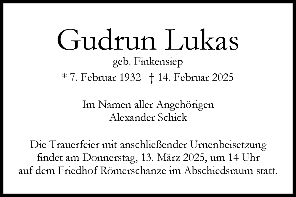 Hier finden Sie alle Traueranzeigen aus der Zeitung, die bisher für Gudrun Lukas erschienen sind. Weitere Traueranzeigen, die in der Zeitung erscheinen, werden hier ebenfalls aufgelistet