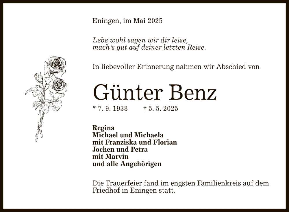 Hier finden Sie alle Traueranzeigen aus der Zeitung, die bisher für Günter Benz erschienen sind. Weitere Traueranzeigen, die in der Zeitung erscheinen, werden hier ebenfalls aufgelistet