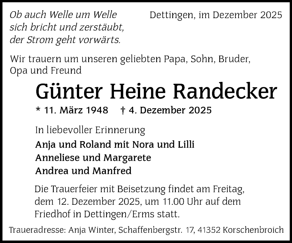 Hier finden Sie alle Traueranzeigen aus der Zeitung, die bisher für Günter Heine Randecker erschienen sind. Weitere Traueranzeigen, die in der Zeitung erscheinen, werden hier ebenfalls aufgelistet