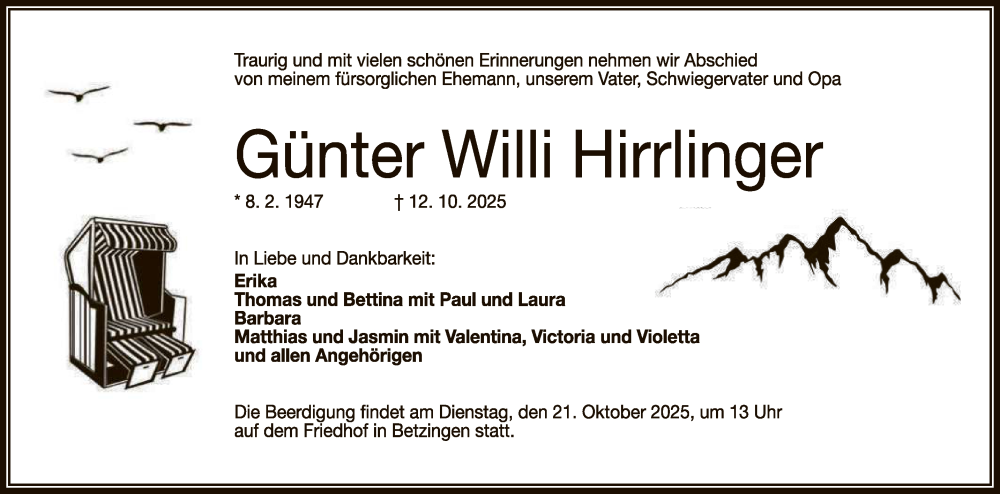 Hier finden Sie alle Traueranzeigen aus der Zeitung, die bisher für Günter Willi Hirrlinger erschienen sind. Weitere Traueranzeigen, die in der Zeitung erscheinen, werden hier ebenfalls aufgelistet