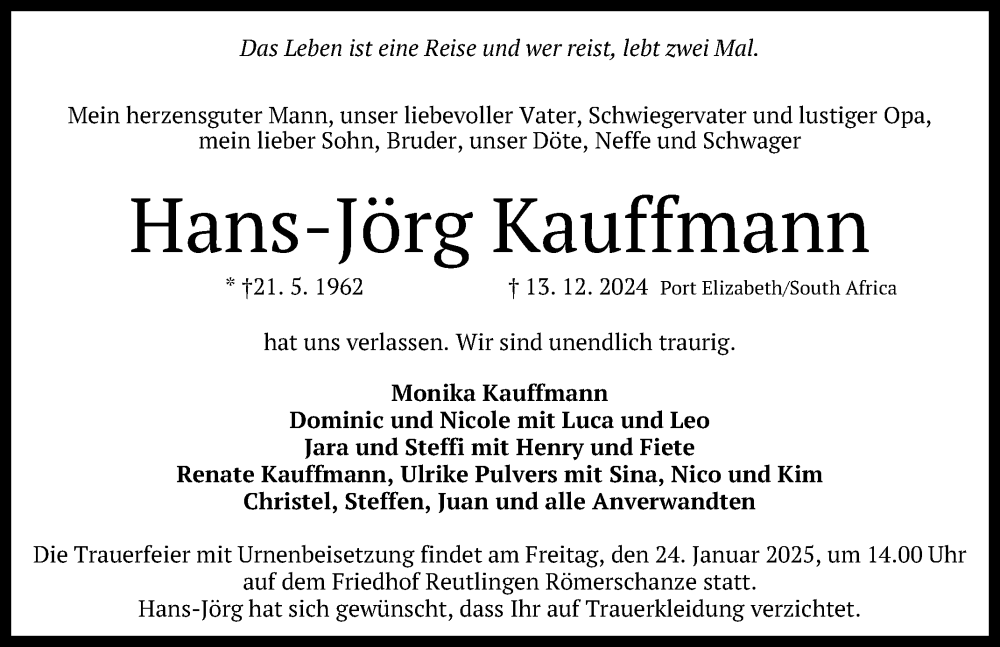 Hier finden Sie alle Traueranzeigen aus der Zeitung, die bisher für Hans Jörg Kauffmann erschienen sind. Weitere Traueranzeigen, die in der Zeitung erscheinen, werden hier ebenfalls aufgelistet