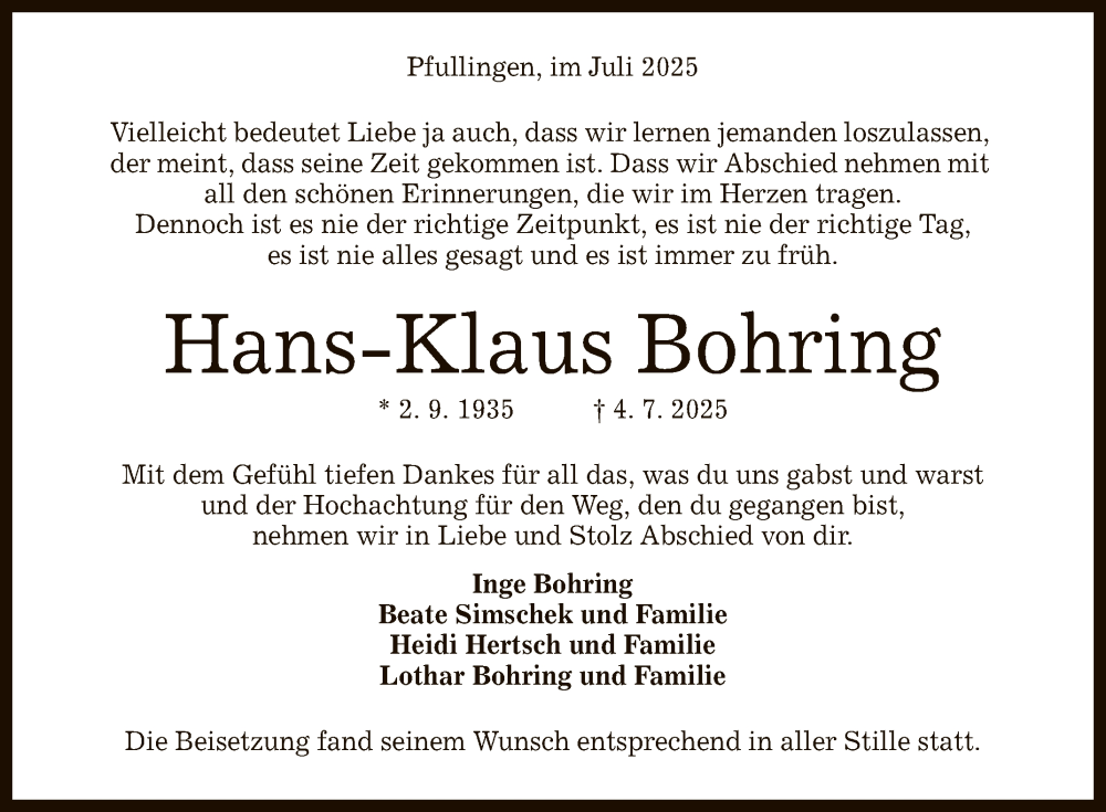 Hier finden Sie alle Traueranzeigen aus der Zeitung, die bisher für Hans-Klaus Bohring erschienen sind. Weitere Traueranzeigen, die in der Zeitung erscheinen, werden hier ebenfalls aufgelistet