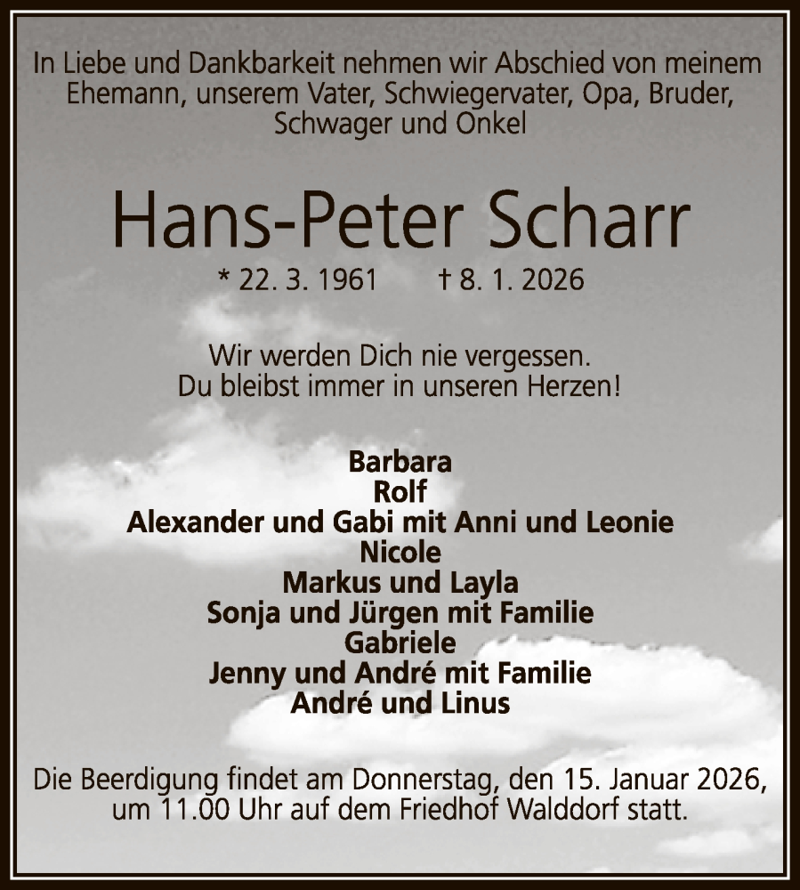 Hier finden Sie alle Traueranzeigen aus der Zeitung, die bisher für Hans-Peter Scharr erschienen sind. Weitere Traueranzeigen, die in der Zeitung erscheinen, werden hier ebenfalls aufgelistet