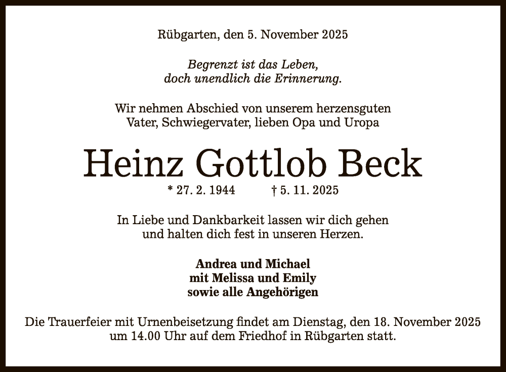 Hier finden Sie alle Traueranzeigen aus der Zeitung, die bisher für Heinz Gottlob Beck erschienen sind. Weitere Traueranzeigen, die in der Zeitung erscheinen, werden hier ebenfalls aufgelistet