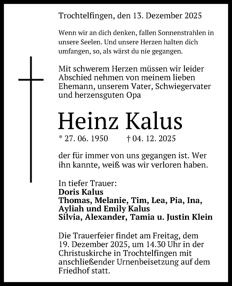 Hier finden Sie alle Traueranzeigen aus der Zeitung, die bisher für Heinz Kalus erschienen sind. Weitere Traueranzeigen, die in der Zeitung erscheinen, werden hier ebenfalls aufgelistet