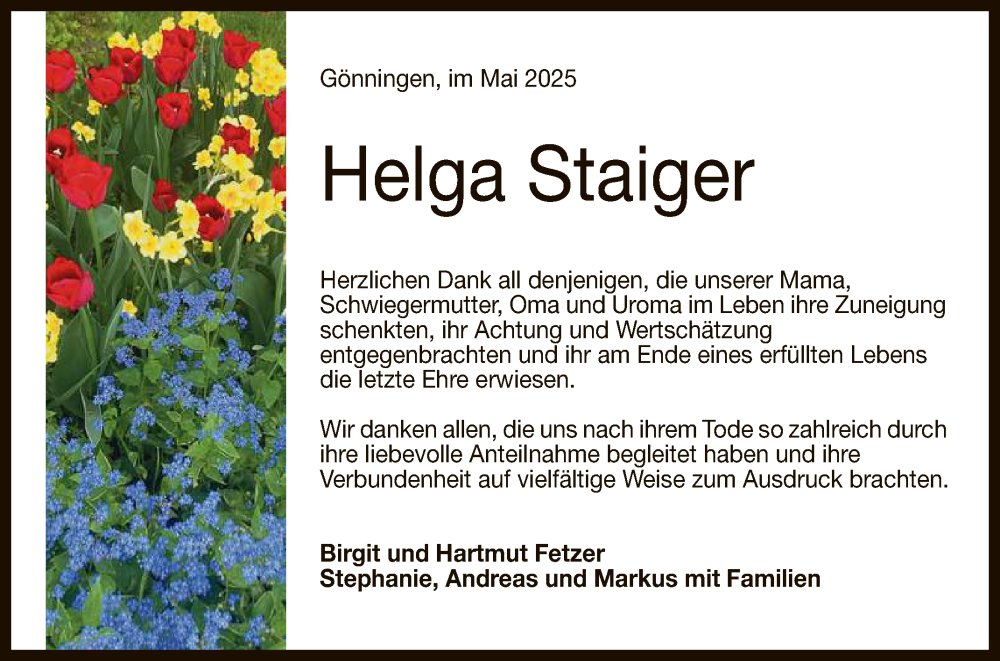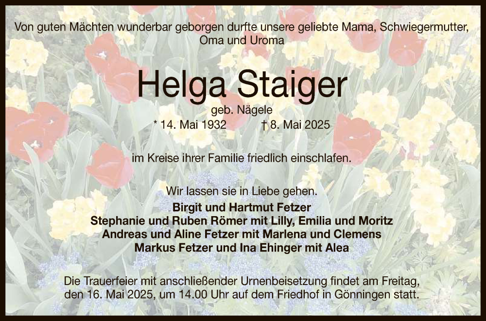 Hier finden Sie alle Traueranzeigen aus der Zeitung, die bisher für Helga Staiger erschienen sind. Weitere Traueranzeigen, die in der Zeitung erscheinen, werden hier ebenfalls aufgelistet