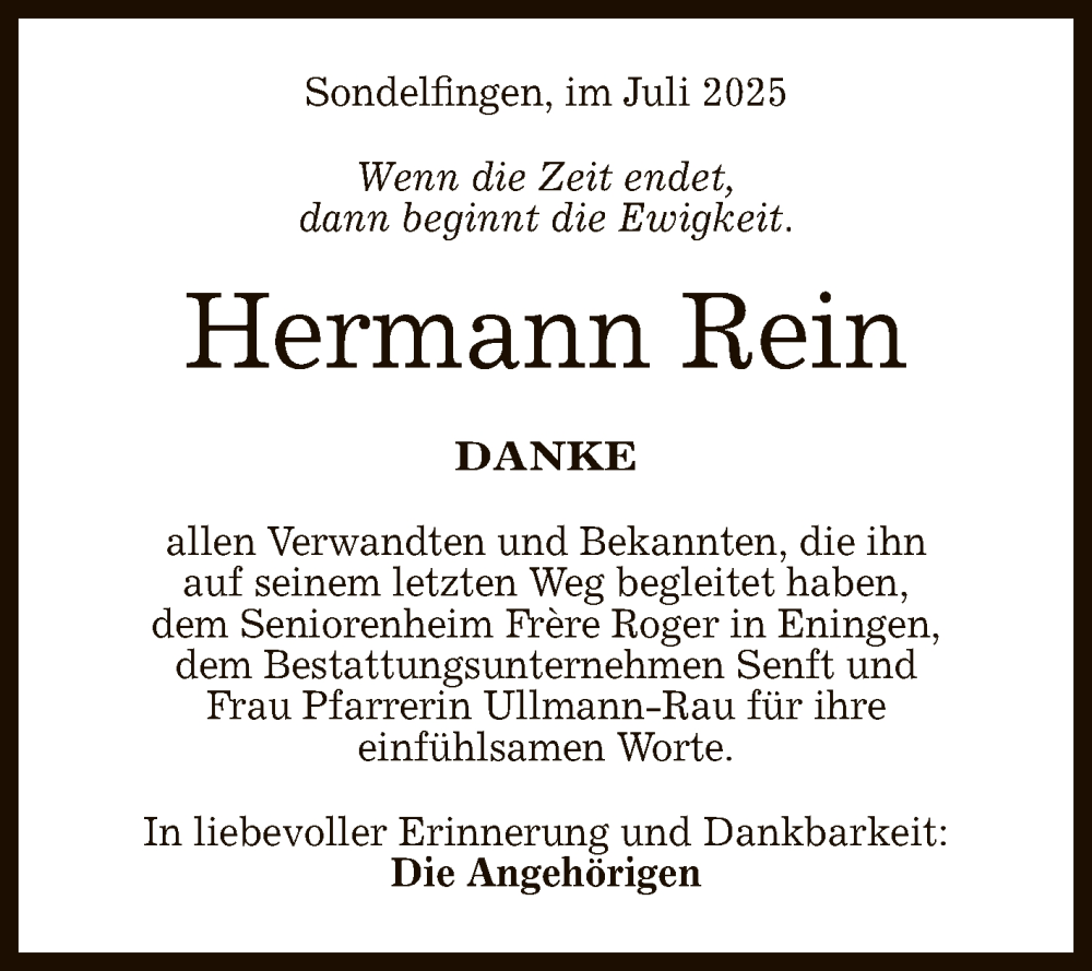 Hier finden Sie alle Traueranzeigen aus der Zeitung, die bisher für Hermann Rein erschienen sind. Weitere Traueranzeigen, die in der Zeitung erscheinen, werden hier ebenfalls aufgelistet