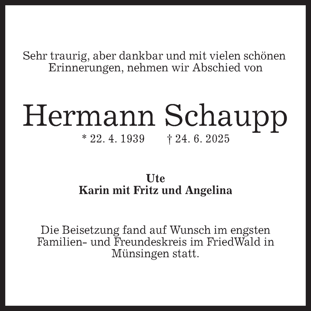 Hier finden Sie alle Traueranzeigen aus der Zeitung, die bisher für Hermann Schaupp erschienen sind. Weitere Traueranzeigen, die in der Zeitung erscheinen, werden hier ebenfalls aufgelistet