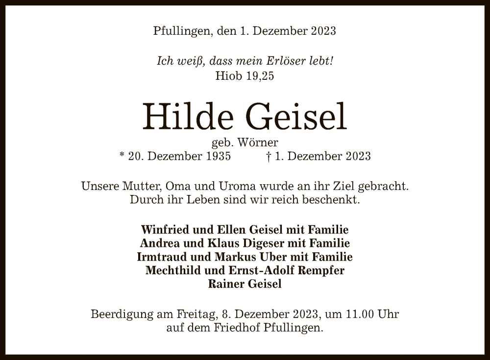 Hier finden Sie alle Traueranzeigen aus der Zeitung, die bisher für Hilde Geisel erschienen sind. Weitere Traueranzeigen, die in der Zeitung erscheinen, werden hier ebenfalls aufgelistet