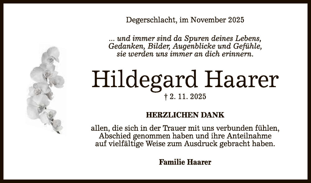 Hier finden Sie alle Traueranzeigen aus der Zeitung, die bisher für Hildegard Haarer erschienen sind. Weitere Traueranzeigen, die in der Zeitung erscheinen, werden hier ebenfalls aufgelistet