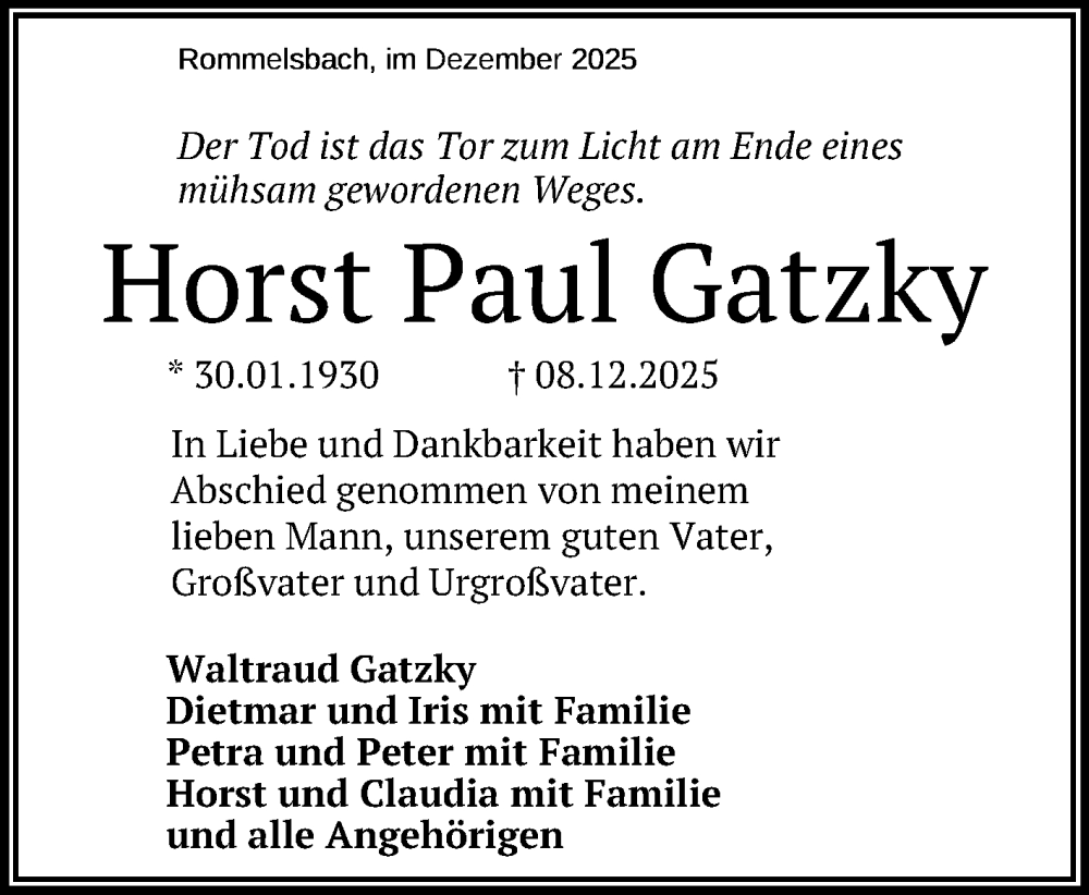 Hier finden Sie alle Traueranzeigen aus der Zeitung, die bisher für Horst Paul Gatzky erschienen sind. Weitere Traueranzeigen, die in der Zeitung erscheinen, werden hier ebenfalls aufgelistet