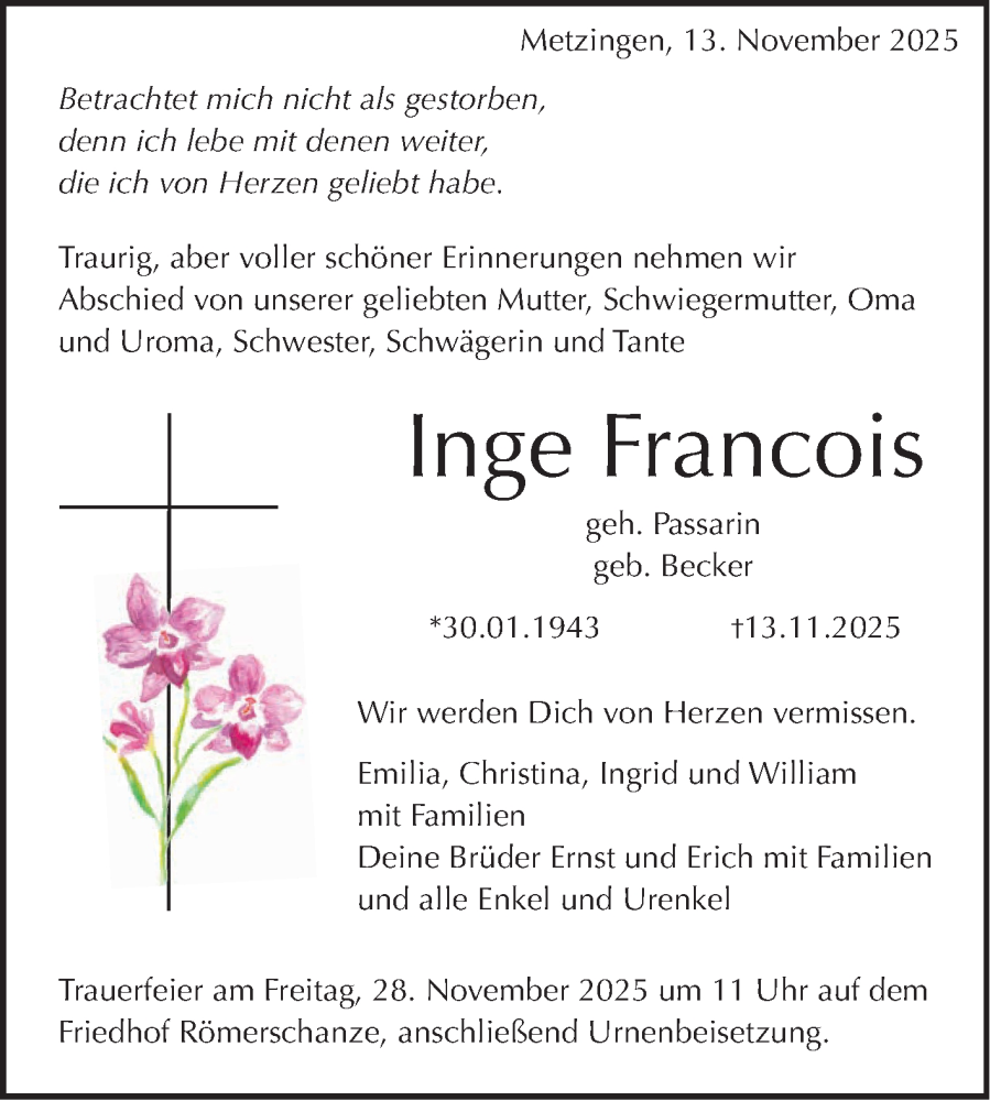 Hier finden Sie alle Traueranzeigen aus der Zeitung, die bisher für Inge Francois erschienen sind. Weitere Traueranzeigen, die in der Zeitung erscheinen, werden hier ebenfalls aufgelistet