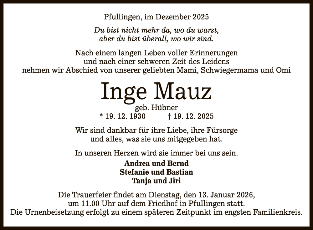 Hier finden Sie alle Traueranzeigen aus der Zeitung, die bisher für Inge Mauz erschienen sind. Weitere Traueranzeigen, die in der Zeitung erscheinen, werden hier ebenfalls aufgelistet