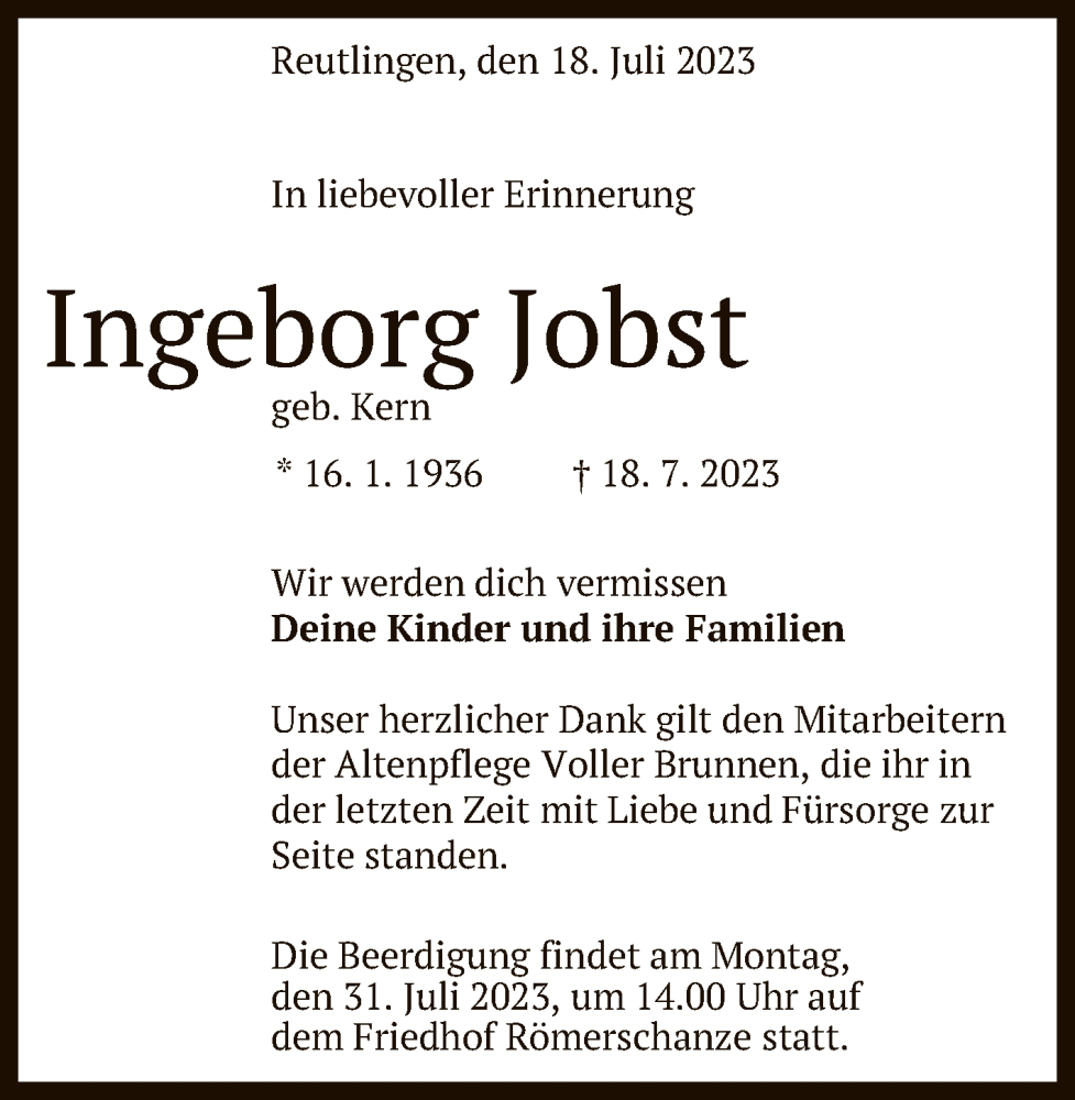 Hier finden Sie alle Traueranzeigen aus der Zeitung, die bisher für Ingeborg Jobst erschienen sind. Weitere Traueranzeigen, die in der Zeitung erscheinen, werden hier ebenfalls aufgelistet