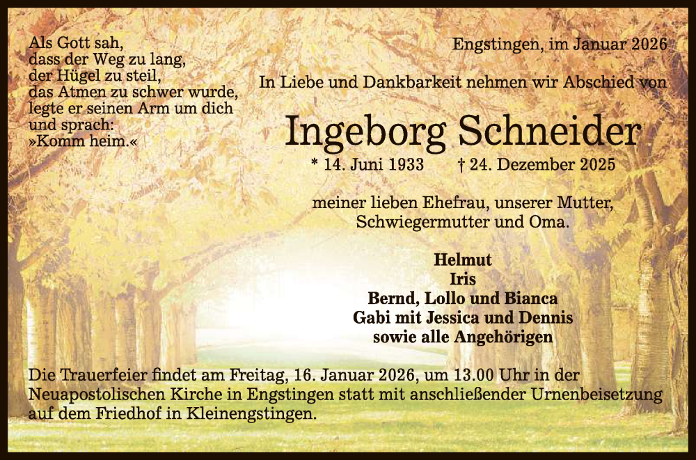Hier finden Sie alle Traueranzeigen aus der Zeitung, die bisher für Ingeborg Schnei erschienen sind. Weitere Traueranzeigen, die in der Zeitung erscheinen, werden hier ebenfalls aufgelistet