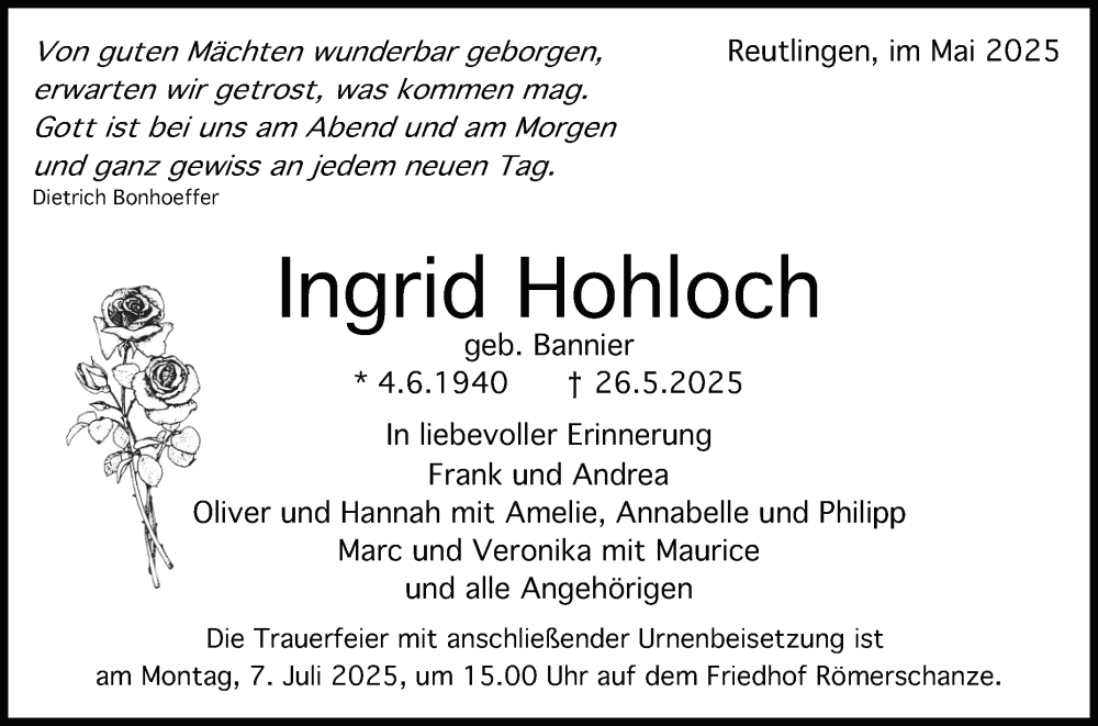 Hier finden Sie alle Traueranzeigen aus der Zeitung, die bisher für Ingrid Hohloch erschienen sind. Weitere Traueranzeigen, die in der Zeitung erscheinen, werden hier ebenfalls aufgelistet