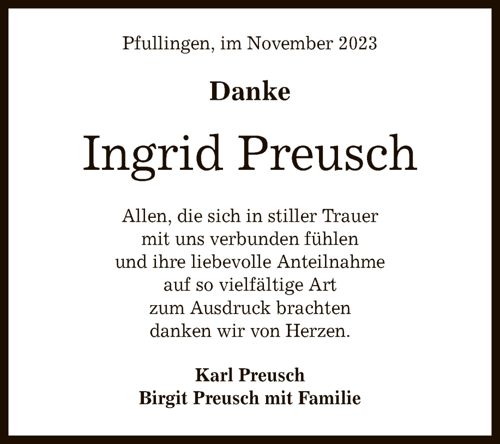 Hier finden Sie alle Traueranzeigen aus der Zeitung, die bisher für Ingrid Preusch erschienen sind. Weitere Traueranzeigen, die in der Zeitung erscheinen, werden hier ebenfalls aufgelistet