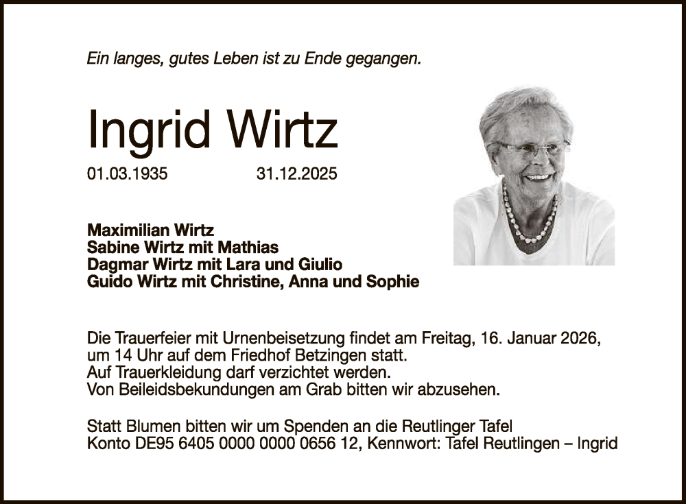 Hier finden Sie alle Traueranzeigen aus der Zeitung, die bisher für Ingrid Wirtz erschienen sind. Weitere Traueranzeigen, die in der Zeitung erscheinen, werden hier ebenfalls aufgelistet