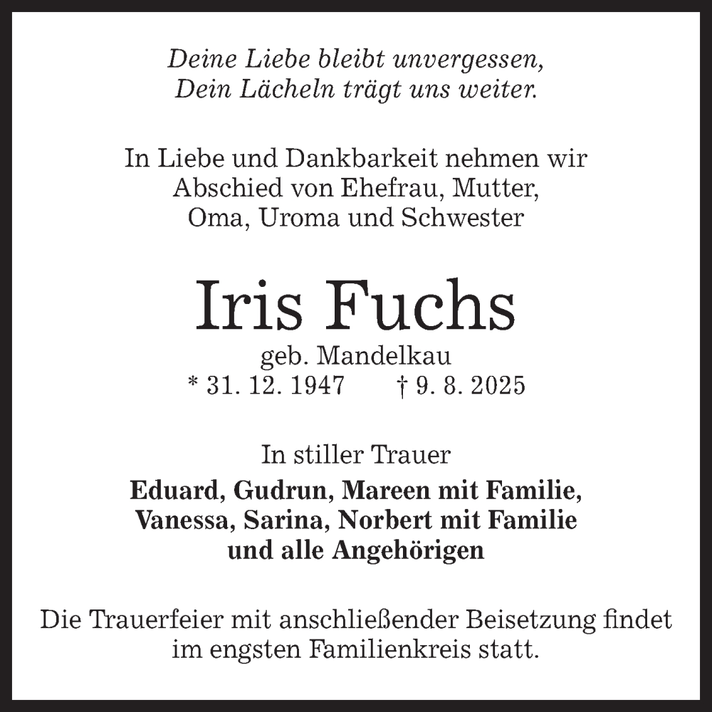 Hier finden Sie alle Traueranzeigen aus der Zeitung, die bisher für Iris Fuchs erschienen sind. Weitere Traueranzeigen, die in der Zeitung erscheinen, werden hier ebenfalls aufgelistet