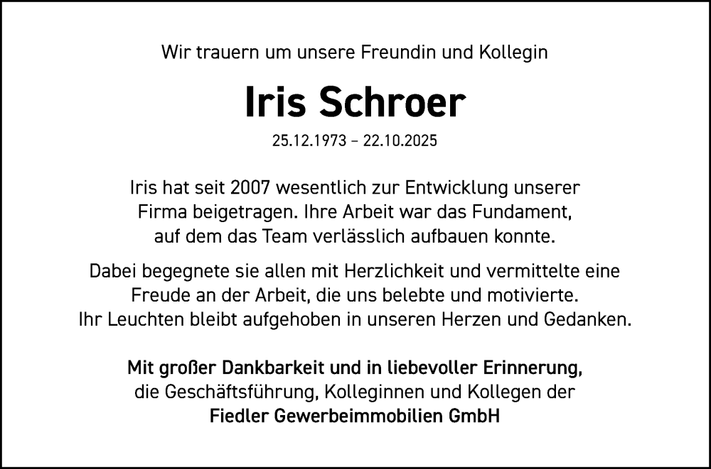 Hier finden Sie alle Traueranzeigen aus der Zeitung, die bisher für Iris Schroer erschienen sind. Weitere Traueranzeigen, die in der Zeitung erscheinen, werden hier ebenfalls aufgelistet