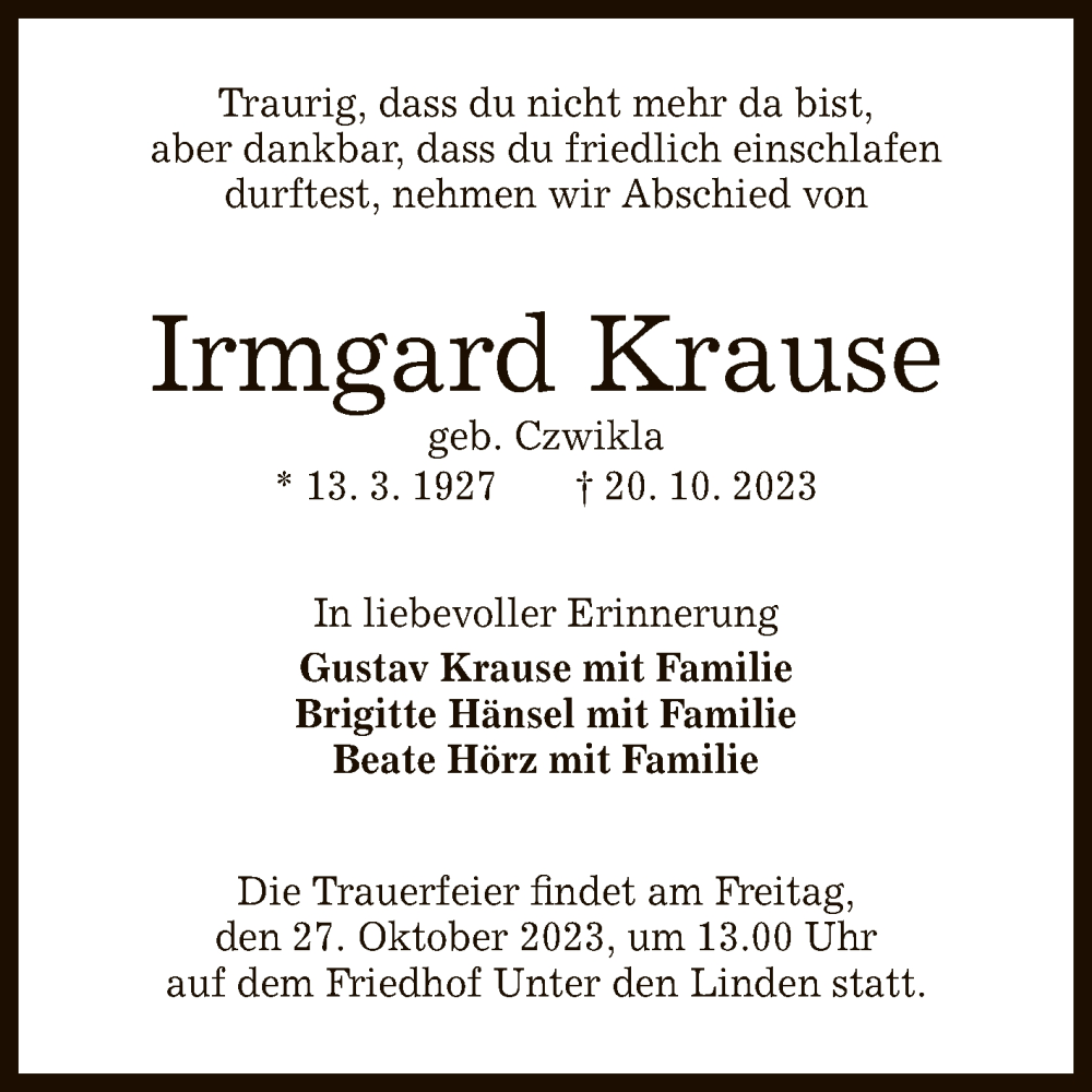 Hier finden Sie alle Traueranzeigen aus der Zeitung, die bisher für Irmgard Krause erschienen sind. Weitere Traueranzeigen, die in der Zeitung erscheinen, werden hier ebenfalls aufgelistet