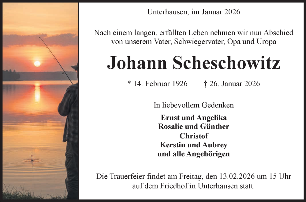 Hier finden Sie alle Traueranzeigen aus der Zeitung, die bisher für Johann Scheschowitz erschienen sind. Weitere Traueranzeigen, die in der Zeitung erscheinen, werden hier ebenfalls aufgelistet