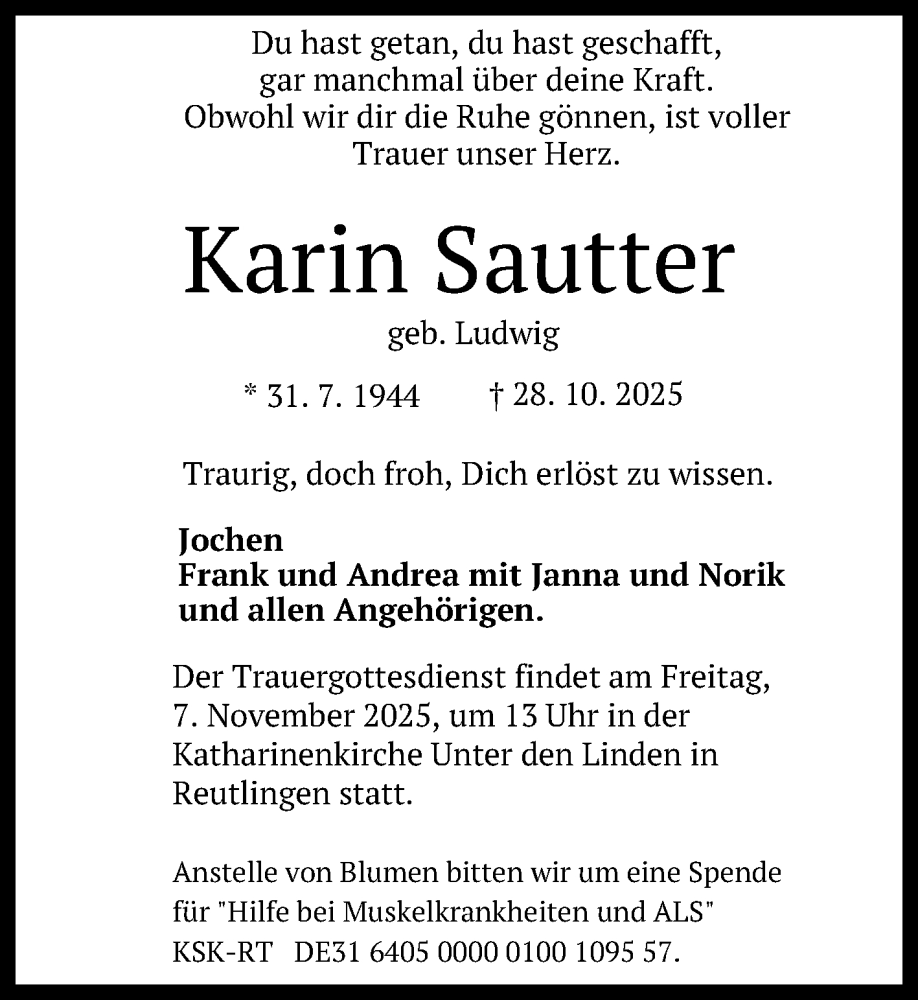 Hier finden Sie alle Traueranzeigen aus der Zeitung, die bisher für Karin Sautter erschienen sind. Weitere Traueranzeigen, die in der Zeitung erscheinen, werden hier ebenfalls aufgelistet