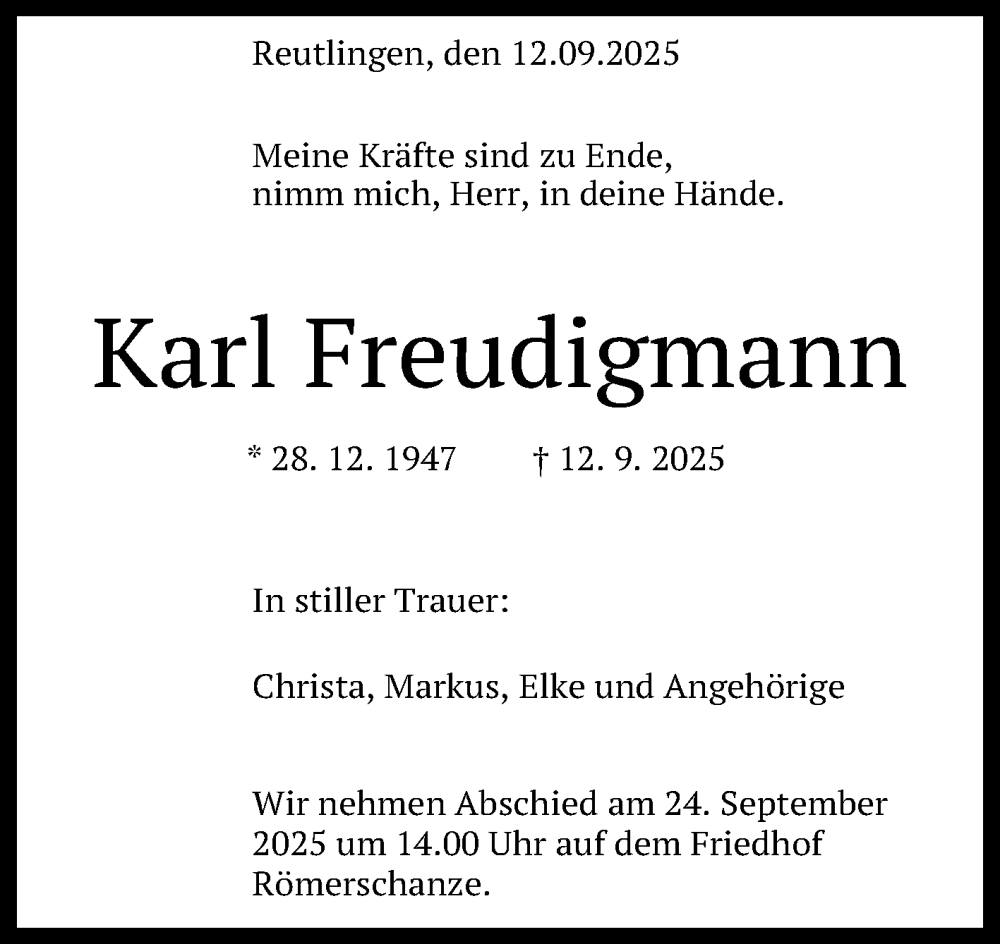 Hier finden Sie alle Traueranzeigen aus der Zeitung, die bisher für Karl Freudigmann erschienen sind. Weitere Traueranzeigen, die in der Zeitung erscheinen, werden hier ebenfalls aufgelistet
