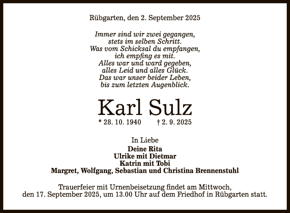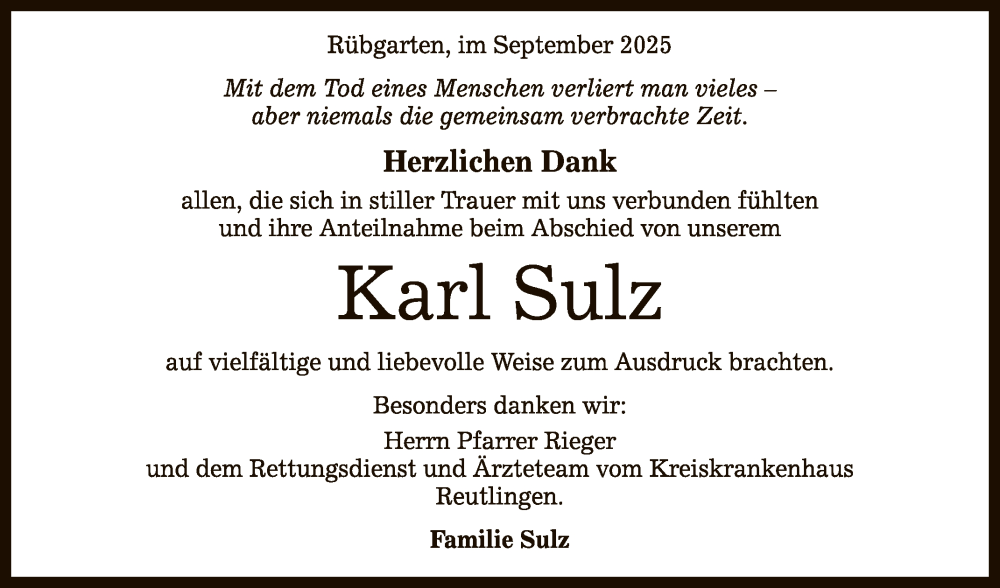 Hier finden Sie alle Traueranzeigen aus der Zeitung, die bisher für Karl Sulz erschienen sind. Weitere Traueranzeigen, die in der Zeitung erscheinen, werden hier ebenfalls aufgelistet