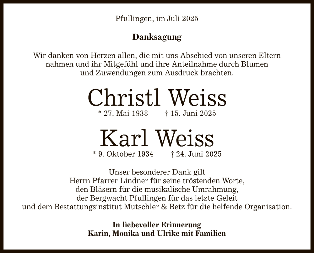Hier finden Sie alle Traueranzeigen aus der Zeitung, die bisher für Karl und Christl Weiss erschienen sind. Weitere Traueranzeigen, die in der Zeitung erscheinen, werden hier ebenfalls aufgelistet