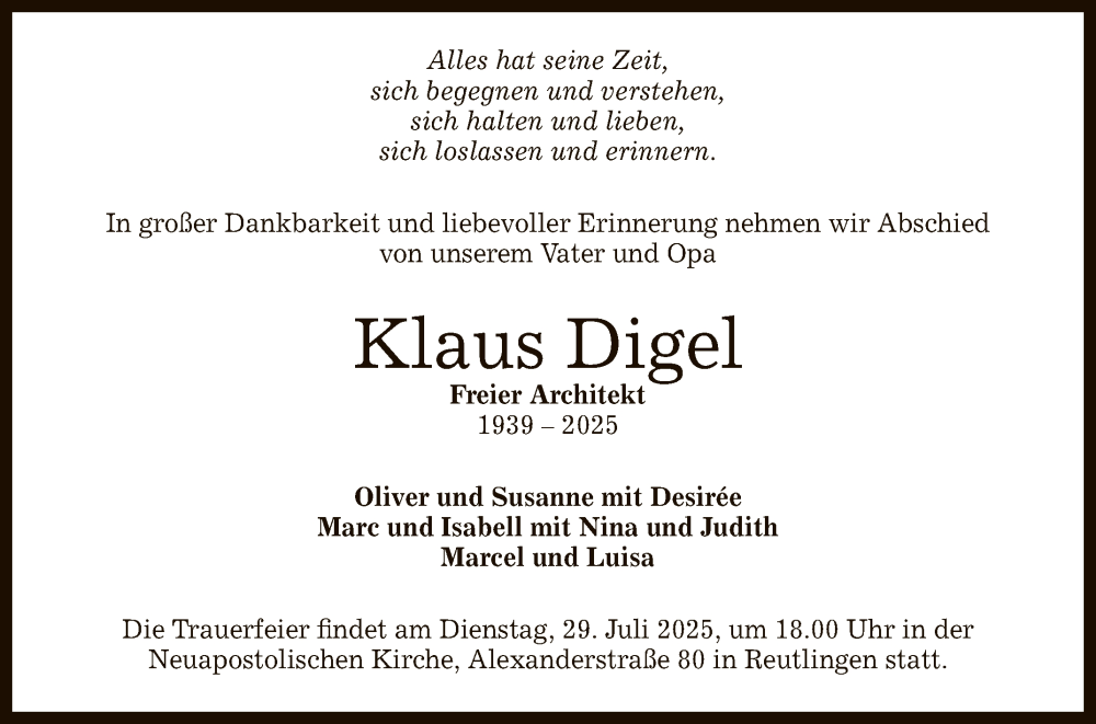 Hier finden Sie alle Traueranzeigen aus der Zeitung, die bisher für Klaus Digel erschienen sind. Weitere Traueranzeigen, die in der Zeitung erscheinen, werden hier ebenfalls aufgelistet