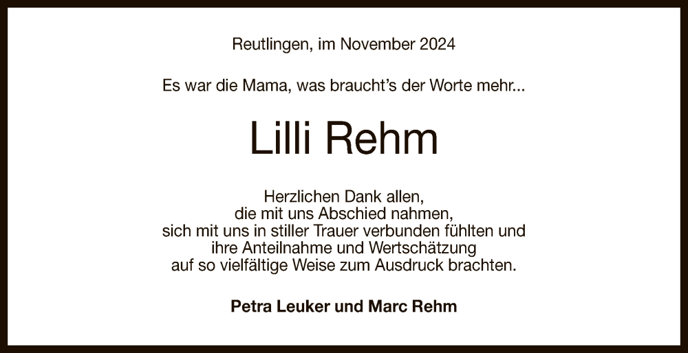 Hier finden Sie alle Traueranzeigen aus der Zeitung, die bisher für Lilli Rehm erschienen sind. Weitere Traueranzeigen, die in der Zeitung erscheinen, werden hier ebenfalls aufgelistet