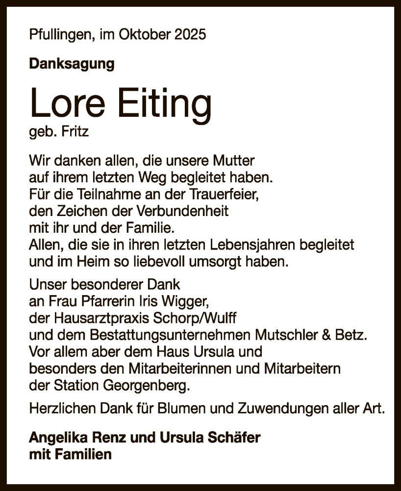 Hier finden Sie alle Traueranzeigen aus der Zeitung, die bisher für Lore Eiting erschienen sind. Weitere Traueranzeigen, die in der Zeitung erscheinen, werden hier ebenfalls aufgelistet