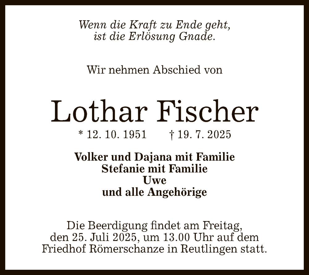 Hier finden Sie alle Traueranzeigen aus der Zeitung, die bisher für Lothar Fischer erschienen sind. Weitere Traueranzeigen, die in der Zeitung erscheinen, werden hier ebenfalls aufgelistet