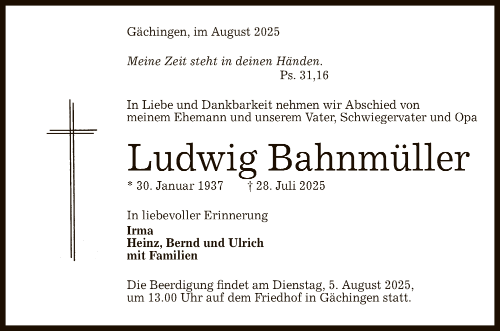 Hier finden Sie alle Traueranzeigen aus der Zeitung, die bisher für Ludwig Bahnmüller erschienen sind. Weitere Traueranzeigen, die in der Zeitung erscheinen, werden hier ebenfalls aufgelistet