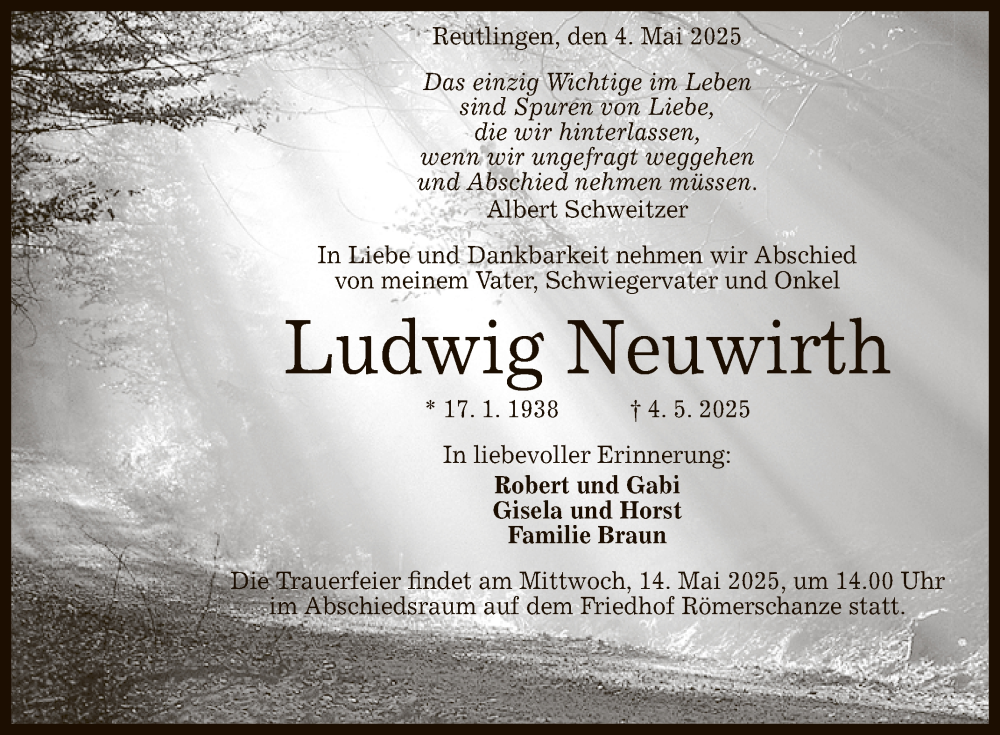 Hier finden Sie alle Traueranzeigen aus der Zeitung, die bisher für Ludwig Neuwirth erschienen sind. Weitere Traueranzeigen, die in der Zeitung erscheinen, werden hier ebenfalls aufgelistet