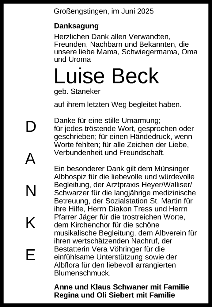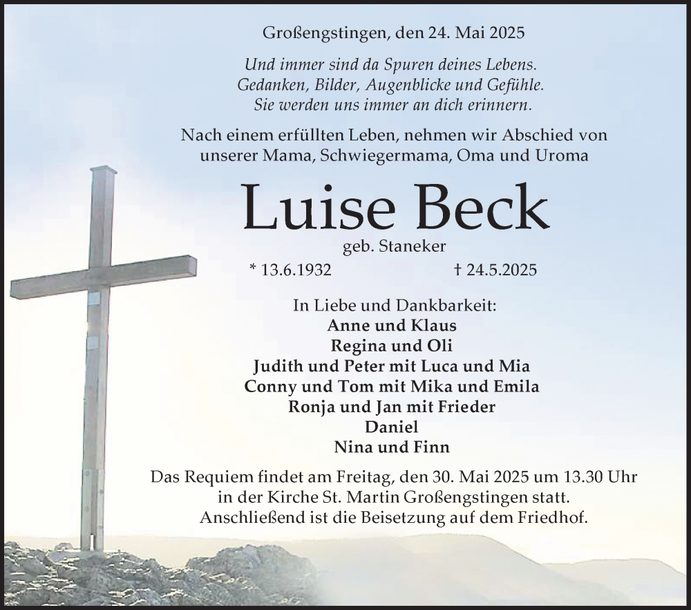 Hier finden Sie alle Traueranzeigen aus der Zeitung, die bisher für Luise Beck erschienen sind. Weitere Traueranzeigen, die in der Zeitung erscheinen, werden hier ebenfalls aufgelistet