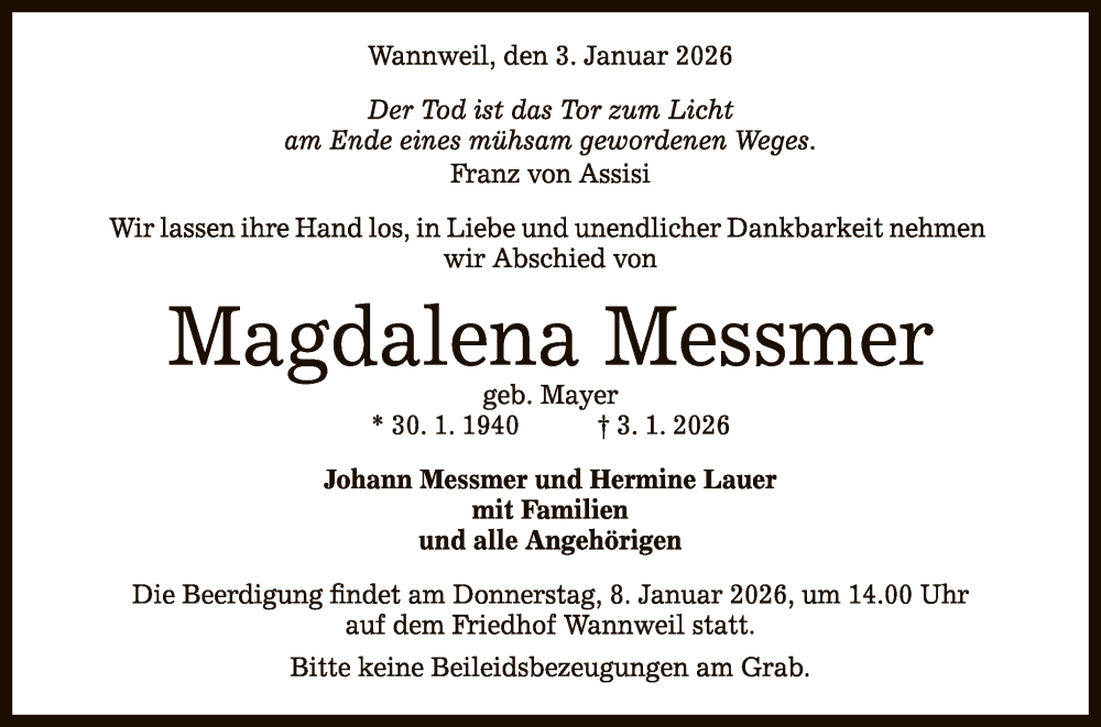 Hier finden Sie alle Traueranzeigen aus der Zeitung, die bisher für Magdalena Messmer erschienen sind. Weitere Traueranzeigen, die in der Zeitung erscheinen, werden hier ebenfalls aufgelistet