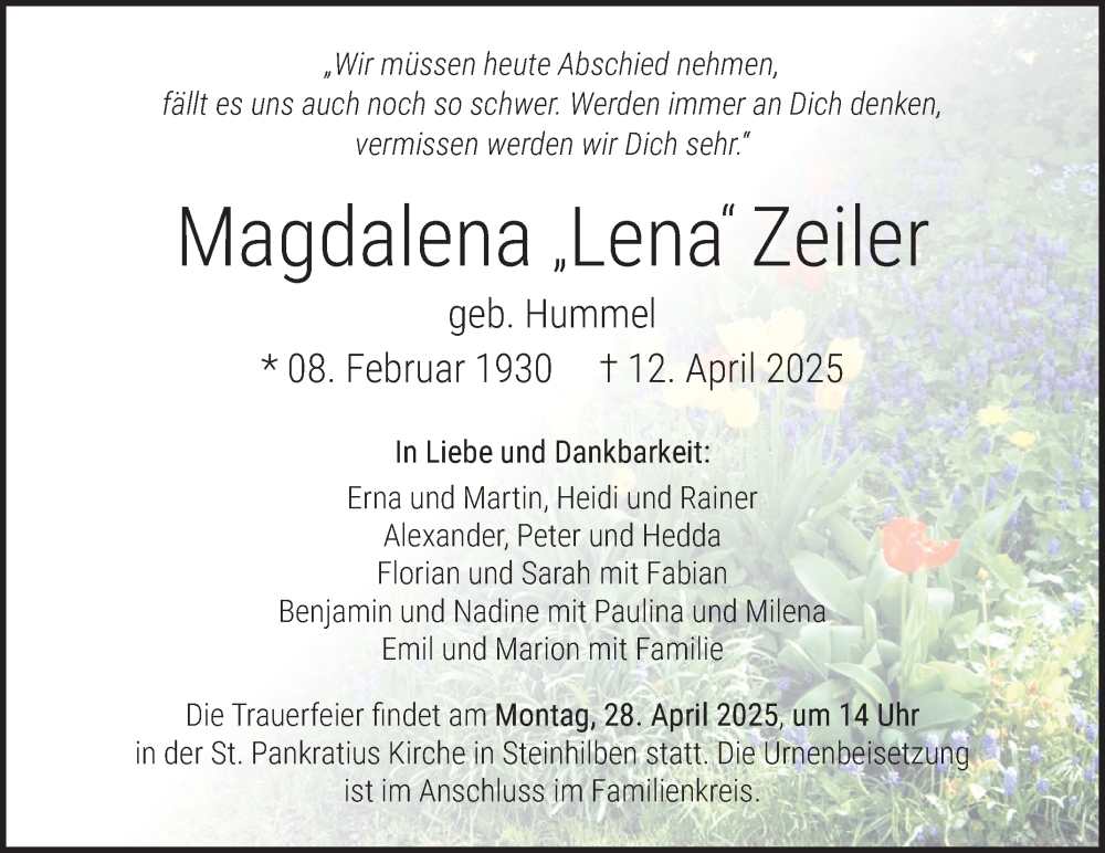 Hier finden Sie alle Traueranzeigen aus der Zeitung, die bisher für Magdalena Zeiler erschienen sind. Weitere Traueranzeigen, die in der Zeitung erscheinen, werden hier ebenfalls aufgelistet