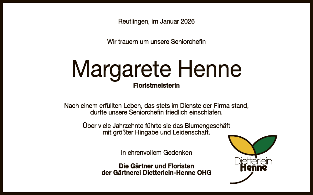 Hier finden Sie alle Traueranzeigen aus der Zeitung, die bisher für Margarete Henne erschienen sind. Weitere Traueranzeigen, die in der Zeitung erscheinen, werden hier ebenfalls aufgelistet