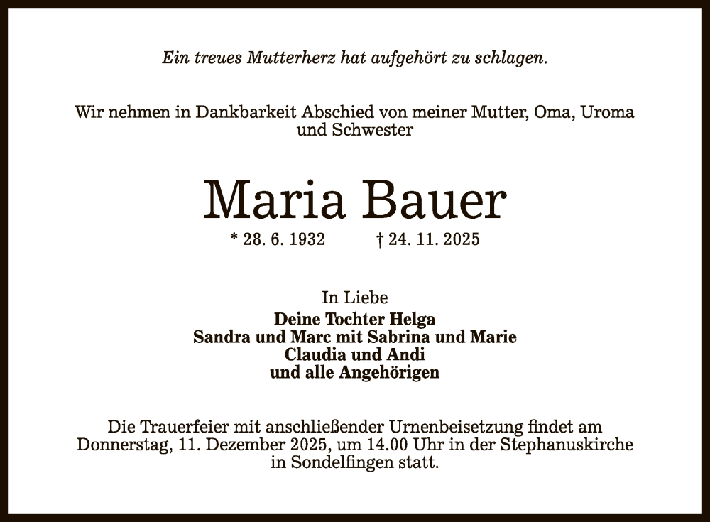 Hier finden Sie alle Traueranzeigen aus der Zeitung, die bisher für Maria Bauer erschienen sind. Weitere Traueranzeigen, die in der Zeitung erscheinen, werden hier ebenfalls aufgelistet
