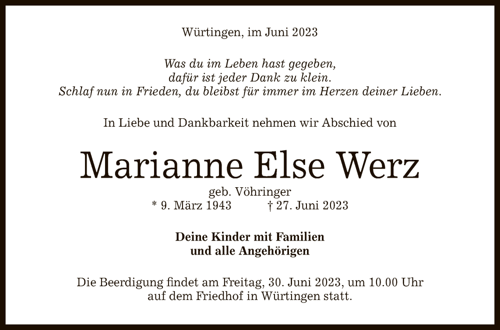 Hier finden Sie alle Traueranzeigen aus der Zeitung, die bisher für Marianne Else Werz erschienen sind. Weitere Traueranzeigen, die in der Zeitung erscheinen, werden hier ebenfalls aufgelistet