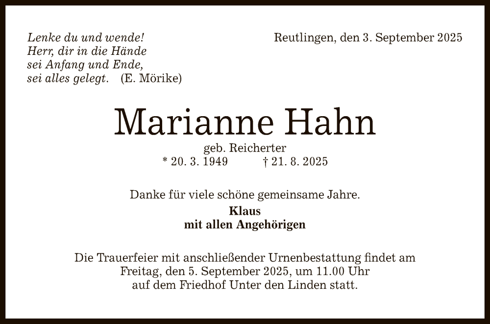 Hier finden Sie alle Traueranzeigen aus der Zeitung, die bisher für Marianne Hahn erschienen sind. Weitere Traueranzeigen, die in der Zeitung erscheinen, werden hier ebenfalls aufgelistet