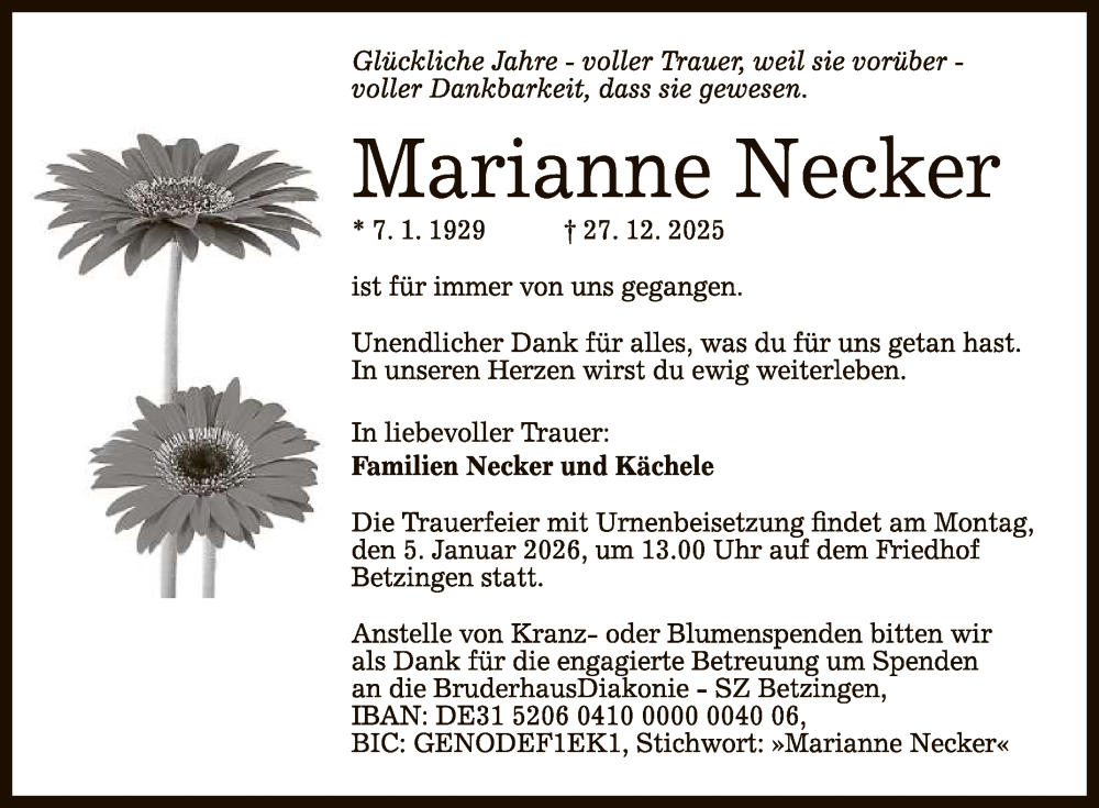 Hier finden Sie alle Traueranzeigen aus der Zeitung, die bisher für Marianne Necker erschienen sind. Weitere Traueranzeigen, die in der Zeitung erscheinen, werden hier ebenfalls aufgelistet