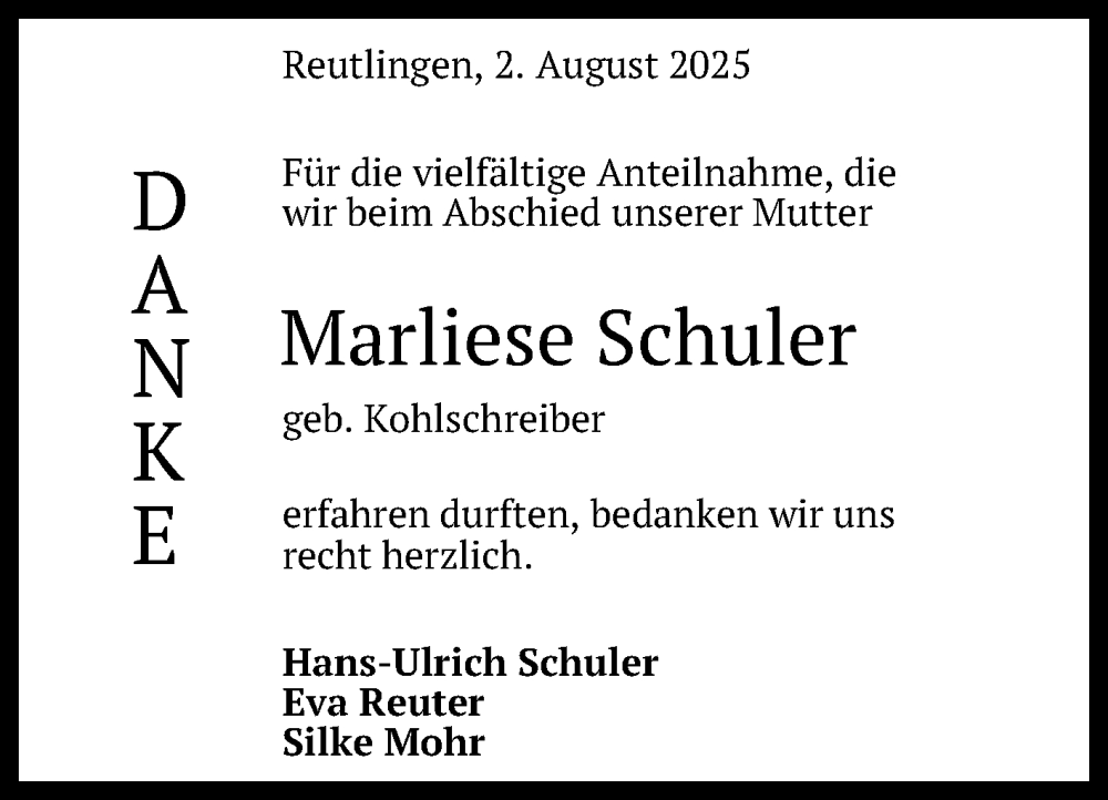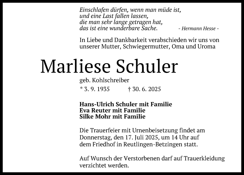 Hier finden Sie alle Traueranzeigen aus der Zeitung, die bisher für Marliese Schuler erschienen sind. Weitere Traueranzeigen, die in der Zeitung erscheinen, werden hier ebenfalls aufgelistet